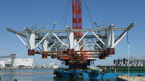 海上コンテナターミナルの桟橋・護岸として数多く採用されている「ジャケット工法」は、鋼管トラス構造のジャケット上部工を陸上(工場)で製作し、施工場所まで運搬して基礎杭と一体化させる工法です。
