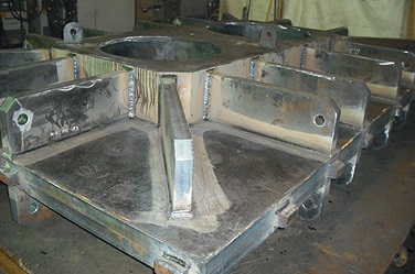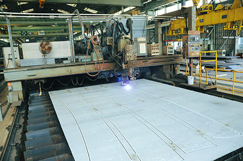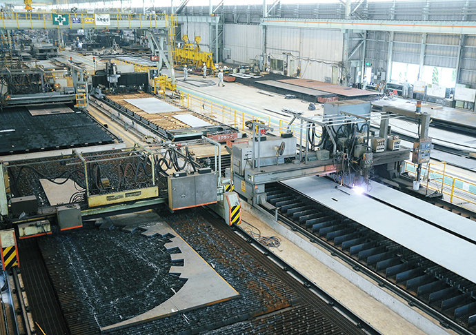 部材切断から組立溶接まで行います。屋内で組立できない大型製品は分割ブロックまで製作し、屋外作業場で大組立を行います。