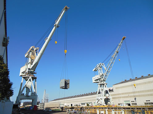 主に大型製品の大組立を行います。海洋ドックはドック内に水を入れてゲートを外すと、製品を浮かせて引き出すことができます。専用岸壁では、ジブクレーンで船積み・陸揚げができます。