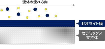 ゼオライト膜の外部と内部に圧力差を設けることで、特定成分を選択的かつ連続操作にて分離・精製することができます。透過させたい成分は、ゼオライトの種類や化学組成、あるいは操作条件によってコントロールすることができます。