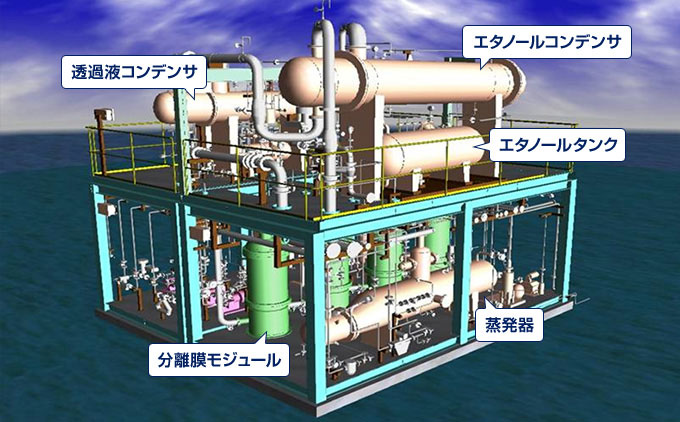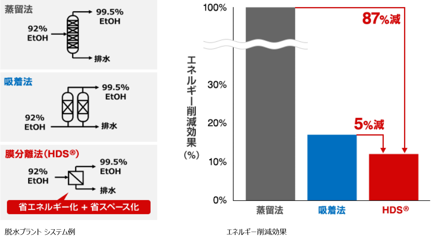 - 脱水システムでは、従来技術である蒸留法や吸着法と比較して、大きな消費エネルギー削減と設置スペースの削減を実現します。新設プラントのみならず、既設プラントへのレトロフィットにおいても、大きなランニングコスト削減が期待できます。