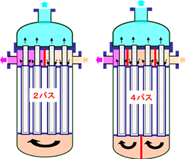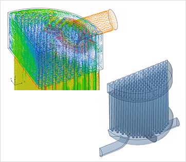 ゼオライト膜エレメントの一端を固定する片持ち構造であり、SUSとセラミックス間の熱応力差に起因するゼオライト膜エレメントの割れ・折れ等の事故が防止できます。また、膜と外管の一対構造(2重管構造)を採用することによって、レイノルズ数が向上するため、ゼオライト膜が持つ分離ポテンシャルを最大限に発揮させることができます。さらには、モジュール内部の流れ解析も駆使し、仕切板設置によるパス数の調整、膜エレメントの配置調整、処理する流体の供給方法も最適にデザインしています。