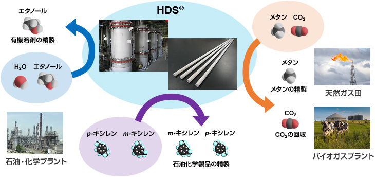 有機溶剤の精製・溶剤脱水・溶剤再生リサイクル(溶剤の回収・再生・リサイクル、溶媒の回収・再生・リサイクル)、バイオガスからのメタンガス精製(二酸化炭素分離・除去)、パラフィン・キシレン異性体分離(炭化水素精製)など、様々な混合流体に対して、効率的な膜分離システムをご提案します。