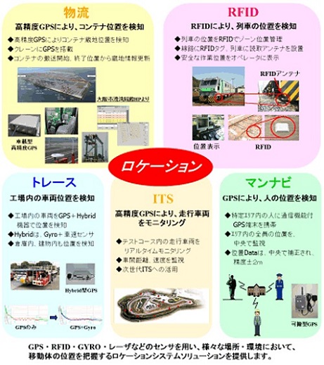 物流、交通、製造の各シーンにおいて、高精度GNSSをはじめ、RFID、レーザー、ジャイロ、マッチングマップなどの各種センシング複合技術により、シームレスな移動体管理ソリューションを提供します。