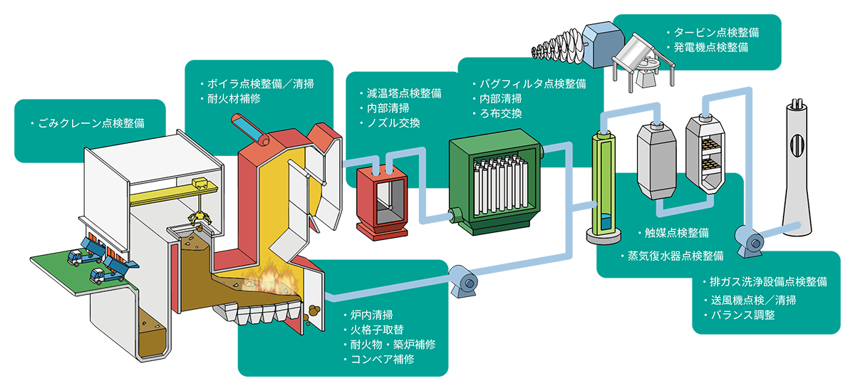 当社は数多くのごみ焼却施設、リサイクル施設を納入してきましたが、これらの施設の安定・安全操業を維持・継続していだだけるよう、アフターサービス事業、運転管理事業および薬剤販売事業を展開しています。