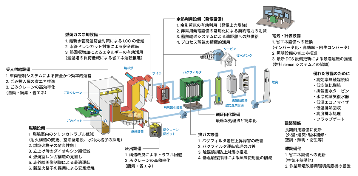 近年、自治体の地方財政の逼迫、環境負荷低減(地球温暖化対策)などを背景として、従来の単なる機能維持のための整備・補修から、最新技術を取り入れて施設をリニューアルする、長期利用・延命化のニーズが高まっています。当社は、長期安定、経済性、環境・省エネの基本コンセプトを満たし、循環型社会の形成に貢献できる施設として蘇らせ、長期利用・延命化への取り組みを積極的に行なっています。