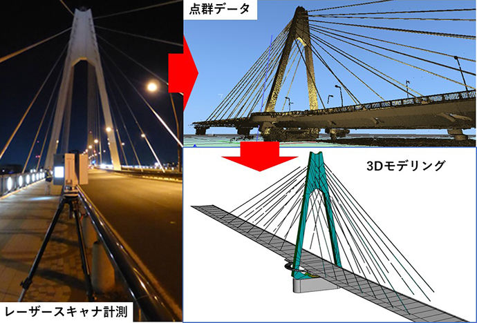 現在、工場製作支援ツールとして使われている三次元プロダクトモデルを、橋梁保全全体で活用するため、レーザースキャナなどの三次元計測データをプロダクトモデルに取り込み、橋梁保全データベースとして活用するための開発を進めています。