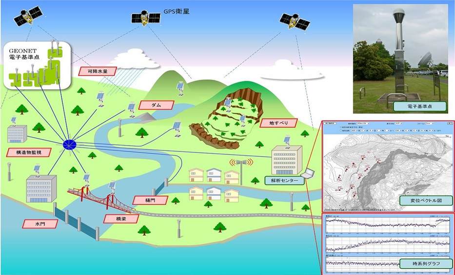 地震や地滑りの予測に有効となる地盤・地殻変動の監視や構造物変位(道路、橋梁、水門、ダム、堤防などのインフラ設備)の位置の変動監視に活用し、測位結果と各種情報管理アルゴリズムを組合せたシステムを提供します。