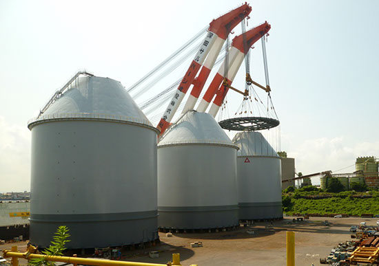 写真は貯炭サイロと呼ばれる、火力発電所の燃料貯蔵庫用構造物です。直径30m超、高さ45m超に及ぶこの大型構造物を当社のドックで一体組みし、現場まで海上輸送することで、現地工事の短縮を達成しました。