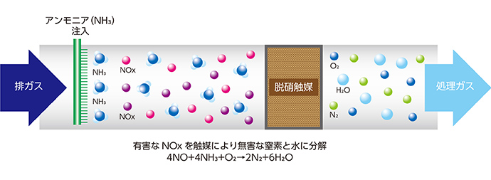 火力発電所やごみ焼却発電施設、化学プラントなどの固定施設や舶用ディーゼルエンジンから排出される燃焼ガスに含まれる窒素酸化物(NOx)を、アンモニアと反応させて窒素と水に分解し無害化することにより、NOxの排出量を低減します。