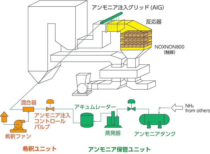 脱硝装置は、脱硝触媒、脱硝反応器、アンモニア注入装置、アンモニア希釈装置、アンモニア貯蔵供給設備などから構成されます。