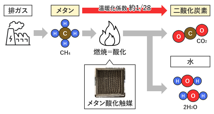 エンジン排ガスに含まれる未燃の燃料メタンを触媒を用いて酸化し、メタンよりも温暖化係数の小さい二酸化炭素として排出することで環境負荷低減に貢献いたします。