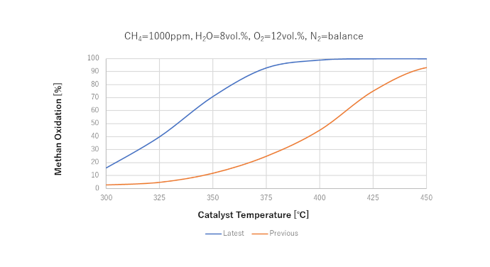 1従来よりも低い温度(350℃)でメタン酸化率70%を達成