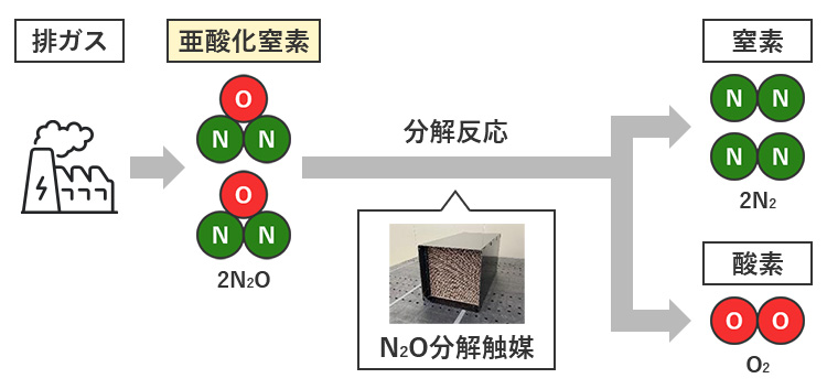 アンモニアエンジンからは温暖化係数が二酸化炭素の約265倍のN2Oが排出されますが、触媒を用いて排出されたN2Oを効率的に分解することで環境負荷低減に貢献いたします。