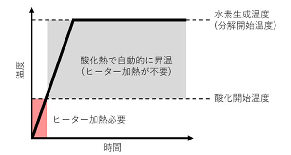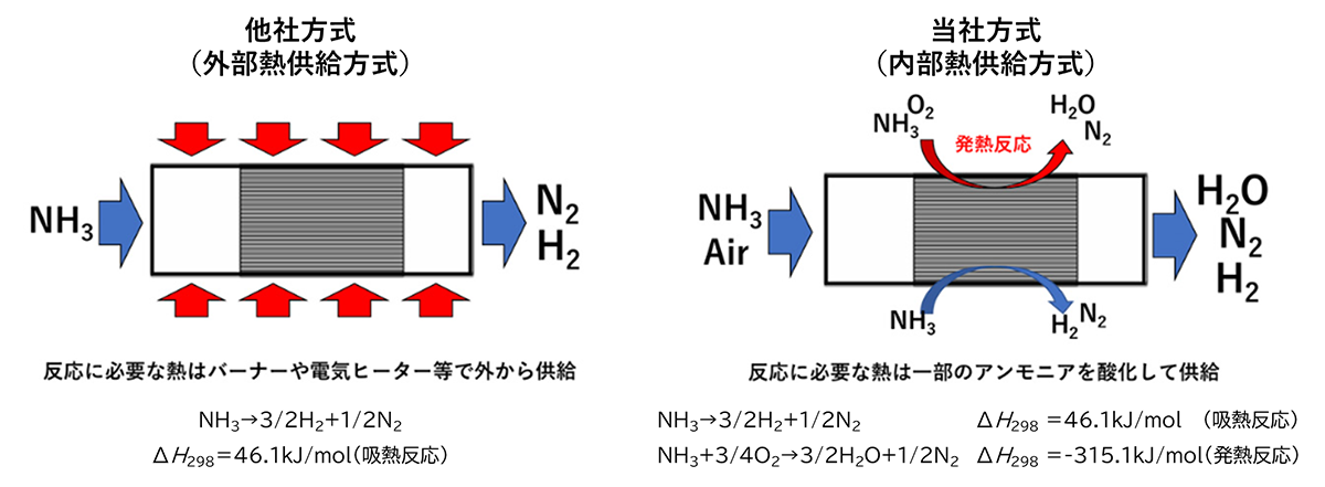 一般的なアンモニアクラッカー触媒は分解に必要な熱を外部からバーナー、ヒーター等で供給しますが、当社の触媒は一部のアンモニアを酸化して分解に必要な熱を確保する内部熱供給方式です。