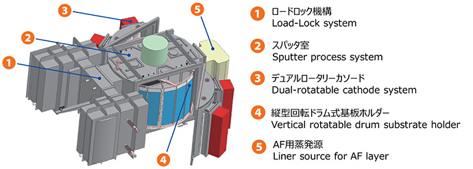縦型回転ドラム式を採用し、ガラス基板やプラスチック基板にAR膜とAFP膜を真空一貫で成膜する装置です。