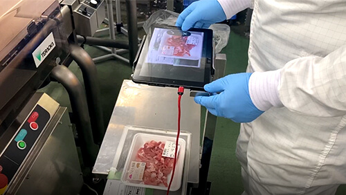 - ・精肉の食品加工センターでは、食材を盛付・包装した上で、商品ラベルや値付けラベルを貼る工程があり、中身種類(牛や豚)や用途(こま切れや切り落としなど)の種類に応じて、正しい商品ラベルを貼付ける必要があり、また多品種少量生産のため、作業者のヒューマンエラーや業務負担大となり、間違ったラベルを貼付して出荷してしまう商品事故が発生していた。