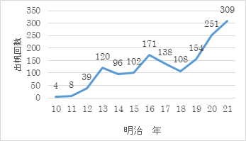 この航路は「ゴールデン・ルート」でした。寄港地に博多、長崎のような大商業地があり、熊本は西南戦争後官庁町、軍人町、商業都市として大きく成長していたため、人物の往来や諸産物の取引も多かったからです。立山一郎氏の調査によると右の図のように明治14年には96便が大阪港を出帆し百貫石港以遠に向かっており、21年には309便と3倍以上に増加していることからも路線の盛況ぶりがうかがえます(3)。