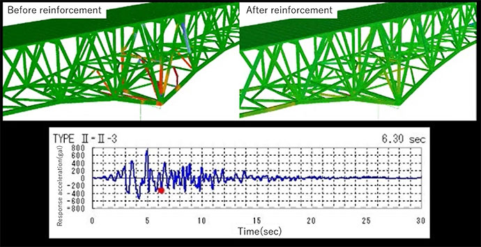 Kanadevia possesses an abundance of dynamic response analysis technology for grasping seismic resistance. This technology can be used for all bridges from long bridges to general bridges. We also possess FEM analysis technology for use under special conditions. This technology is also used for seismic retrofitting of long bridges such as Minato Bridge, Tempozan Ohashi Bridge, and Katashinagawa Bridge.