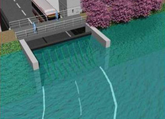 Recent years have seen increasingly serious damage from tsunamis generated by major earthquakes or flooding caused by torrential rain, making disaster-proofing our towns an urgent issue. Kanadevia's Flap-Gate Type Seawall against flood disaster uses the power of nature itself, in the form of tsunamis or storm surges, to the maximum, preventing flooding damage. Given the rarity of these phenomena, the system has been designed to extremely high standards of reliability in order to ensure the requisite level of protection when called upon. You can see a demonstration of this at our Disaster Prevention Solutions Laboratory.