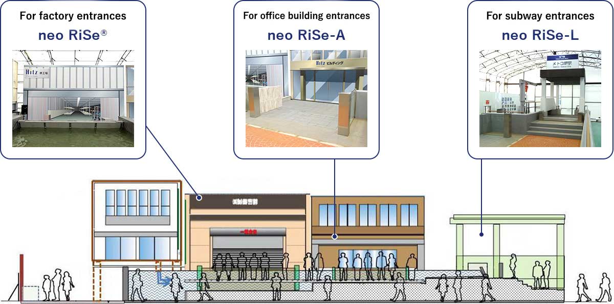 "neo RiSe®" is an abbreviation for "No Energy, No Operation, Rising Seawall," a new approach to tsunami and storm surge protection distinguished by allowing closure of openings without external power or human intervention. Storm surges can be forecast, allowing time to operate the gates to close the opening. But tsunamis are triggered by earthquakes, which strike without warning, and so the gates need to be closed in a very short time indeed. This problem is what neo RiSe® has been designed to solve. We also offer neo RiSe-A, designed to blend in with building exteriors, and neo RiSe-L, design to allow easy installation into existing facilities, to provide solutions for a range of scenarios.