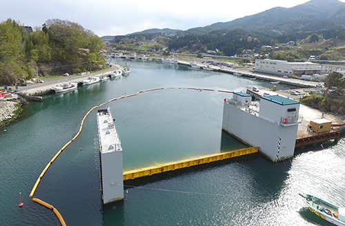 This is installed for two purposes: as a breakwater for tsunamis and storm surges designed to control water level changes behind the breakwater, and as a breakwater designed to increase the calmness of the area behind.