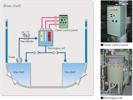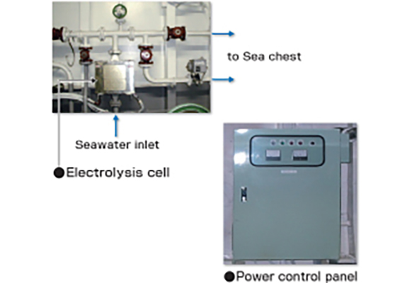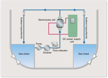 DAIKI HYCHLORATOR injects sodium hypochlorite generated by electrolysis into sea chest, in order to prevent marine organisms from growing or adhering on the inner surface of seawater system.