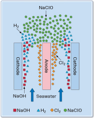 DAIKI HYCHLORATOR generates sodium hypochlorite from seawater by electrolysis. When electrolyze seawater (pH 8, Salinity 3% - average), sodium hypochlorite (NaClO) is produced by the following reaction.