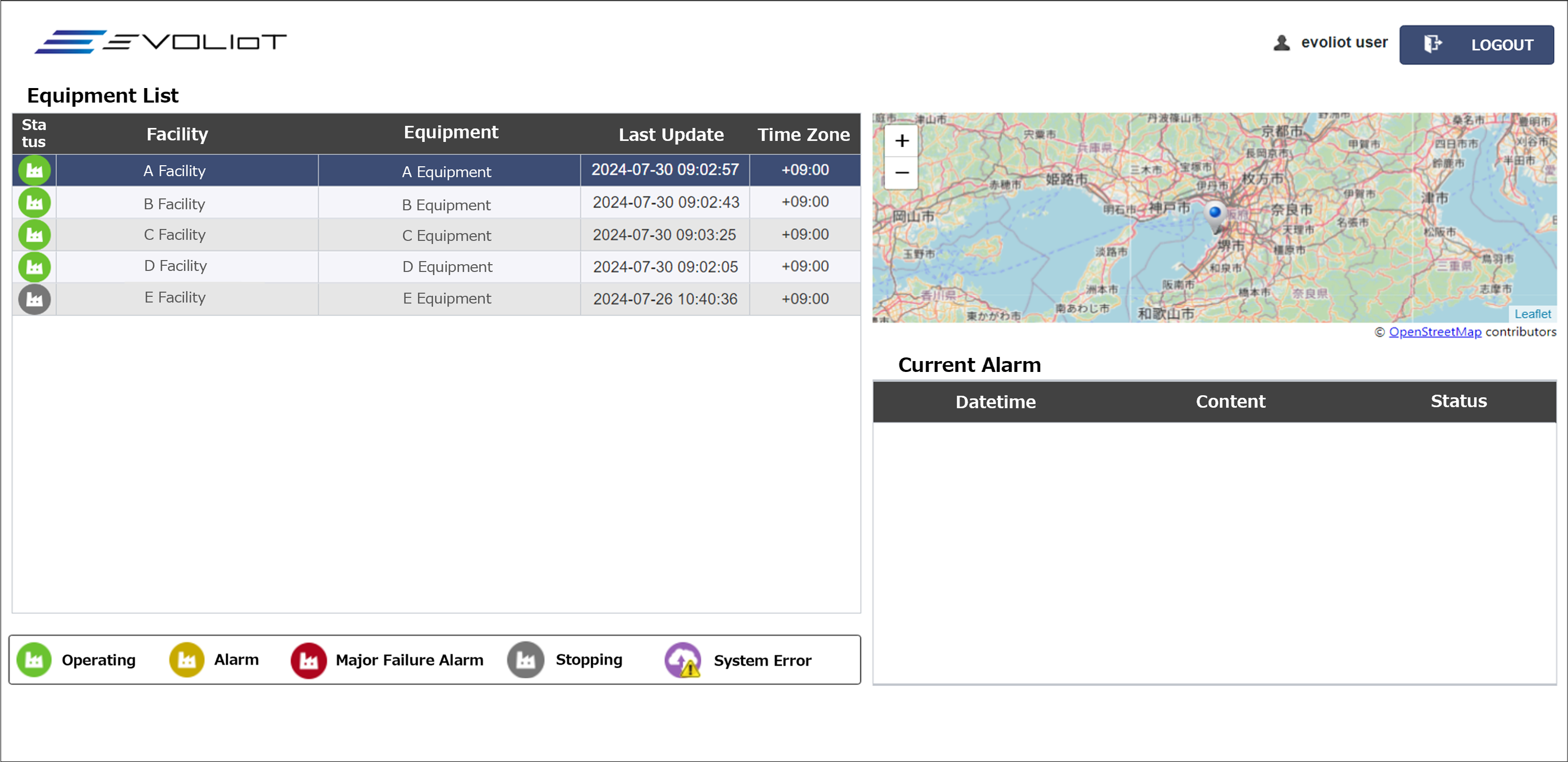 The list of active alarms can be checked by displaying the operating status with easily recognizable icons.