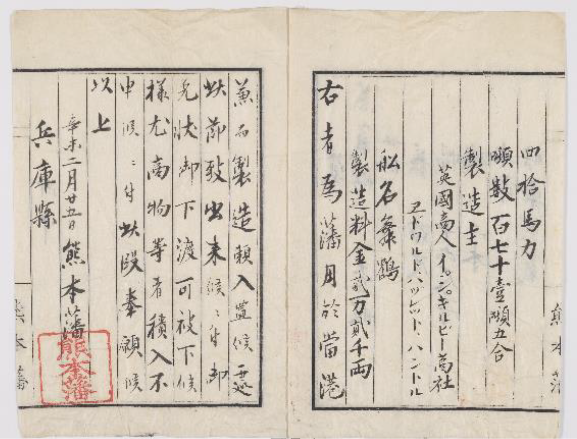 An October 1874 survey by the Meiji government(4) says that Maizuru Maru was a steamship under the control of Shirakawa Prefecture (currently Kumamoto Prefecture), and it was manufactured in "Kobe, Japan" in "Meiji 4 [1871]" measuring "16.5 ken*2 [30.0 m] in total length" and "2.5 ken [4.5 m] in deck width." The New History of Kumamoto City(5) lists under Western ships owned by the Higo (Kumamoto) Domain, "Maizuru Maru: 40 horsepower, 171.5 tons, cargo capacity 160 koku*3 [24 tons], crew size 13 persons," suggesting it was a small transport ship.