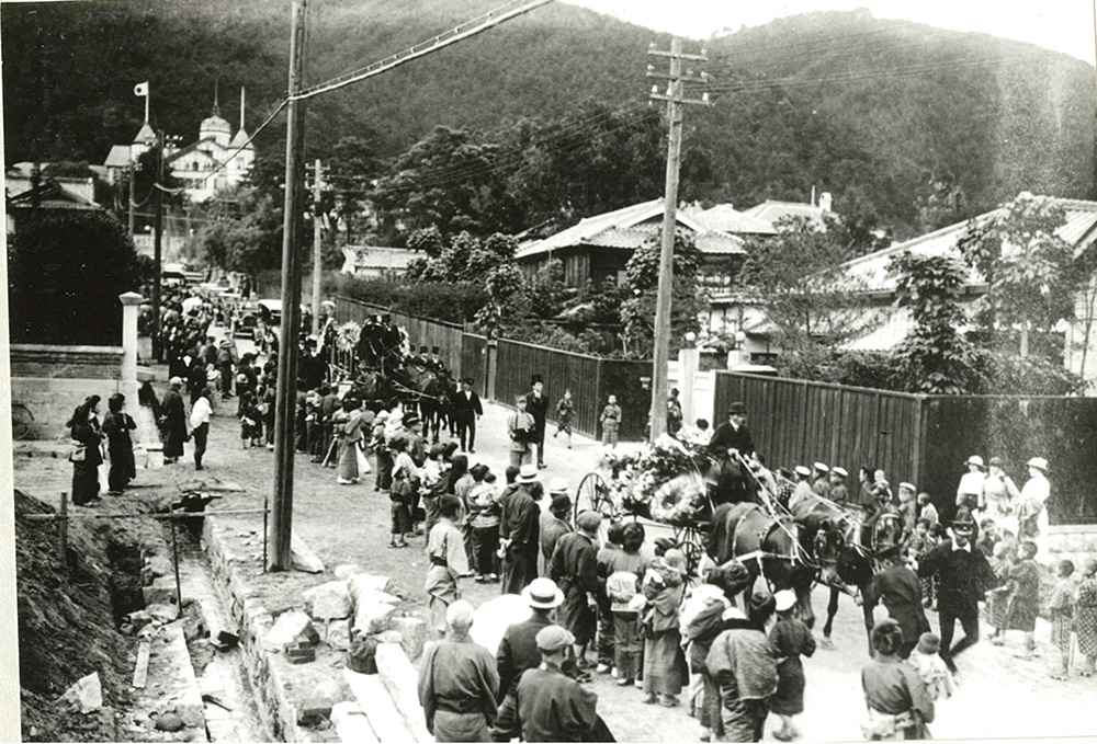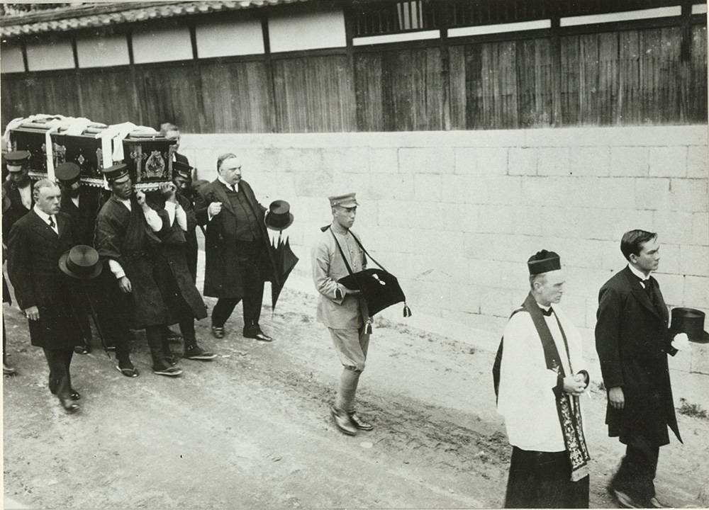 E.H. Hunter entered into eternal rest at eight in the evening on June 2, 1917. He was 75 years old. The newspaper at the time says, "As many as several hundred eminent citizens, both Japanese and foreign, including prominent merchants and women of various groups, were in attendance . . . and over two hundred floral wreaths were laid," and many mourners "wept as they recalled the life of the deceased." Although Christian funeral rites were observed, banners of the Buddhist Women's Association were held during the procession.(1) One obituary reflects, "Hunter was a self-made man who traveled from the United Kingdom to Japan without possessions, made strenuous efforts for the business world of our country for over ten years, and amassed a colossal fortune."(2)