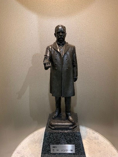 From the entrance of the Nanko head office, make your way to the elevator hall and you will find a bronze statue of E.H. Hunter. The pedestal bears a plaque inscribed Hitachi Zosen. The 60-centimeter-tall statue depicts Hunter in a standing pose, wearing a frock coat, and extending his right hand outward and his left foot slightly forward. The figure is placed on a granite pedestal. The back of the pedestal reveals this was "Produced at Chikkou Works, June 1969." It is a replica of the bronze statue that was erected in front of the Sakurajima head office.