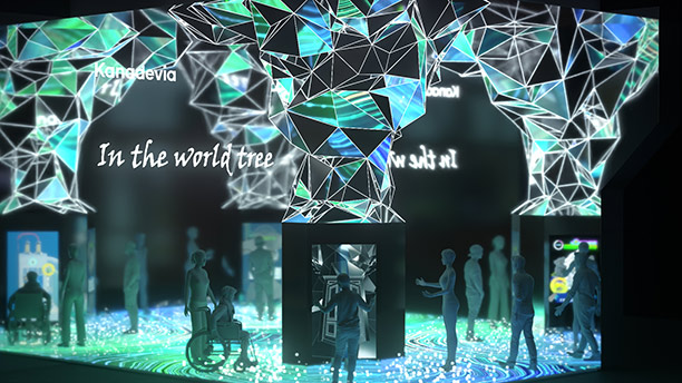 Four mirror signage experience devices (E-motion devices) are installed in the trunk of the world tree located at the center of the booth.