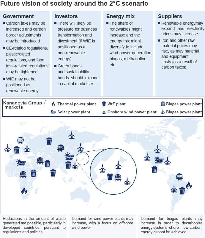Policies related to climate change in each country and region have significant impacts on the profitability and sustainability of each of our businesses. The Kanadevia Group has conducted scenario analysis for businesses that are likely to be affected by climate change using multiple climate change scenarios such as those from the IEA (International Energy Agency). Subsequently, we analyzed the impacts from both risks and opportunity perspectives and formulated Pillars of Success (Materialities).
