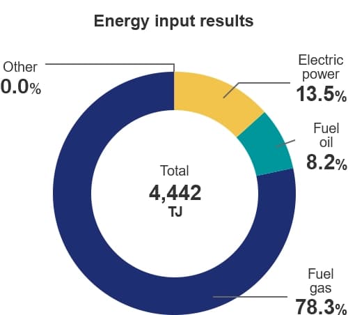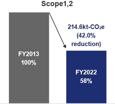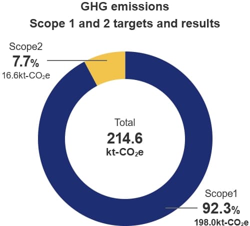 GHG emissions for Scope 1 and 2 were 214.6 kt-CO2e, a 42.0% decrease from the base year, due to a decrease in LNG input resulting from a decrease in demand in the power sales business and promotion of the introduction of green electricity.