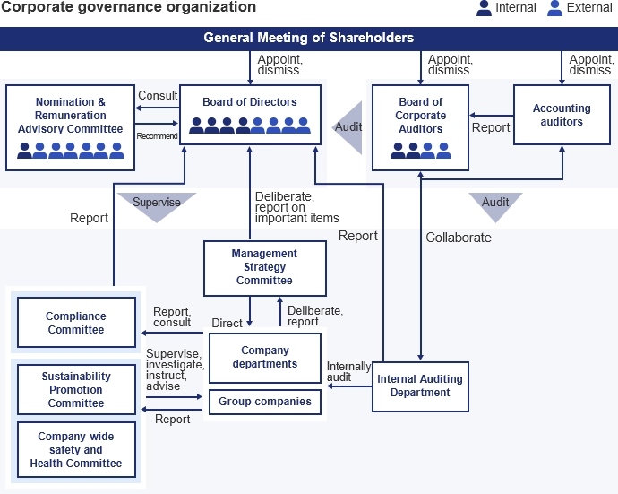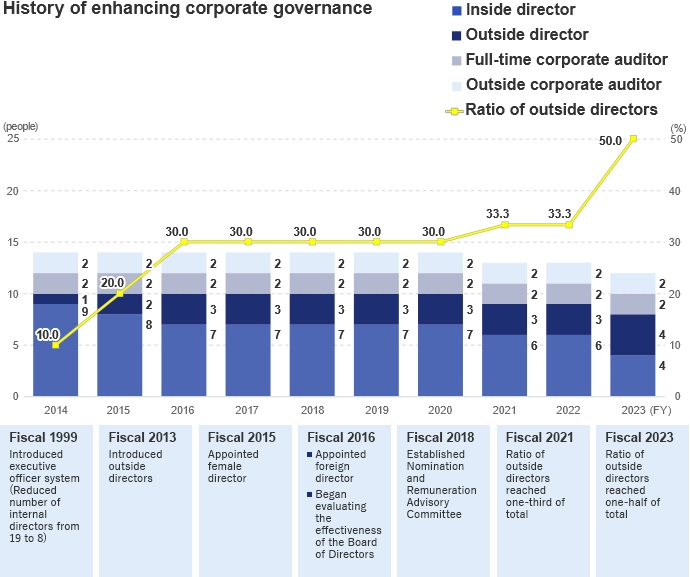 Since June 2023, the Board of Directors has consisted of eight members (including four independent outside directors), a reduction of one member. To further strengthen our governance system, we have increased the number of independent outside directors by one, with independent outside directors now accounting for half of the Board, and from the perspective of expertise and diversity, we have one non-Japanese director and two female directors. In addition to making decisions on matters prescribed by laws, basic management policies and strategies, and other important matters, the Board supervises business execution. The Company has established an executive officer system, under which some of the business execution functions of directors are delegated to executive officers (20 persons), in order to strengthen the supervisory function of the Board of Directors and ensure speedy business execution. Furthermore, by establishing the Management Strategy Committee, we have created a framework to ensure that discussion and decision-making on basic policies and priority measures concerning business management and operations are conducted in a timely and accurate manner. Matters of particular importance are discussed by the Management Strategy Committee and then thoroughly discussed by the Board of Directors before a decision is made on whether or not to proceed.