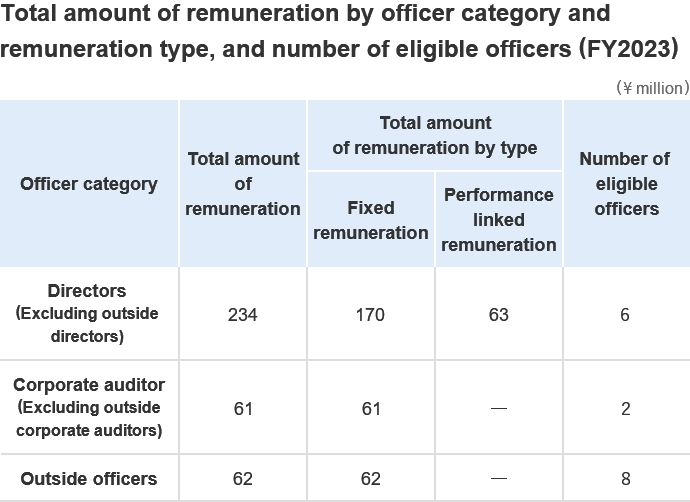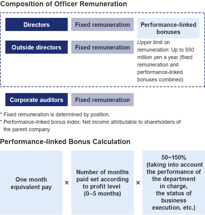 Remuneration for directors comprises fixed remuneration and performance-linked bonuses and is decided for individual directors within the total amount of remuneration approved by a resolution of the General Meeting of Shareholders. So as to ensure their independence, remuneration for outside directors consists only of fixed remuneration.