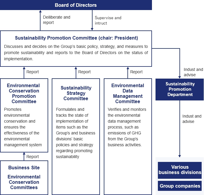 Items discussed by the Sustainability Promotion Committee are submitted to and reported to the Management Strategy Committee and the Board of Directors.