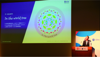 現在と未来、サイバー(仮想)とフィジカル(現実)、人と地球とテクノロジーという概念を融合させる象徴として、世界樹をブースの中心に配置しています。