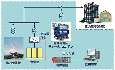 当社が扱う低負荷対応ディーゼルエンジンには、約10%の負荷でも連続運転が可能という特長がある。離島など小規模な電力系統に再生可能エネルギーを大量導入するには、その出力変動をいかに補償するかが重要となるが、低負荷対応ディーゼルエンジンであれば運転可能領域が広いため、電力品質の維持・安定化制御には極めて有利となる。当社とバルチラ社では、実機関を用いて8%負荷での100 時間連続運転試験を行い、運転トレンド、燃料ノズルやピストンの汚れなどから、長期間の低負荷運転が可能なことを実証した。また当社では、この特長を活かし、離島や新興国内陸部などのマイクログリッドを対象とした、風力発電とのハイブリッドシステムを提案している。