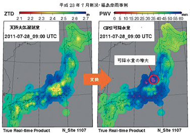 GPS可降水量とは、GPSの電波遅延を利用して算出した観測点上空の水蒸気の積算量のことである。本システムでは、電子基準点を用いて日本全国のGPS可降水量をリアルタイムに得ることが可能である。本システムで得られたGPS可降水量は、民間気象会社や大学、研究機関にて利用され、集中豪雨の予測や地球温暖化プロセスの解明の研究などに応用されている。本報告では、リアルタイムGPS可降水量解析システムの特徴および、最近の研究成果および適用事例について述べる。