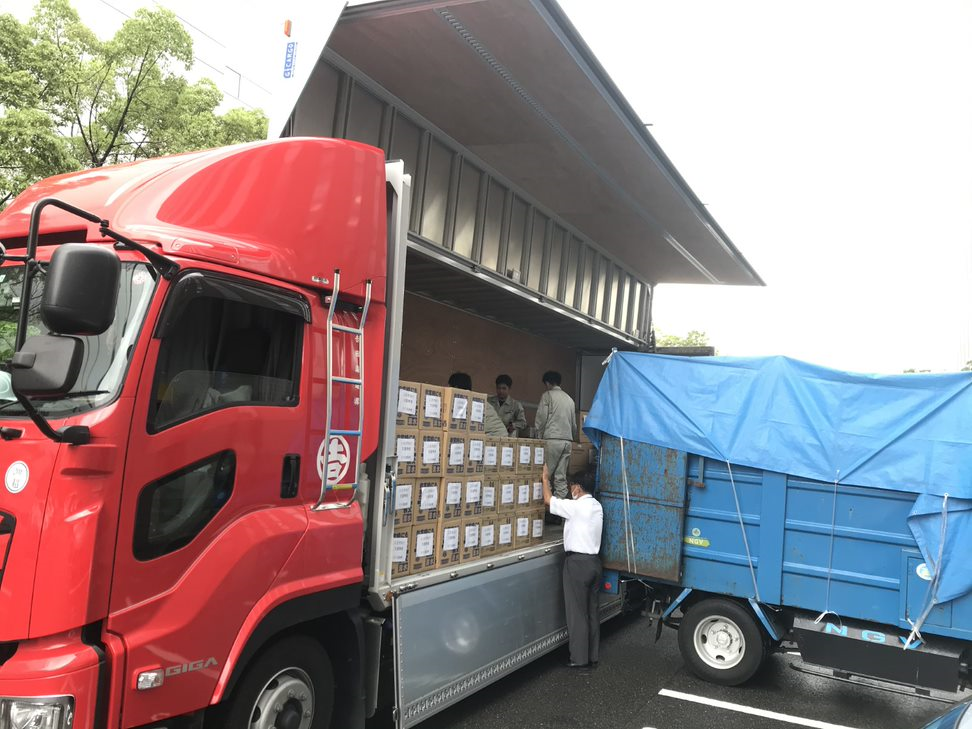 輸送は当社グループで物流を手掛ける株式会社オーナミが担当。10トントラックで大阪から熊本まで輸送しました。また、九州支社の職員が被災地に赴いて荷下作業を行いました。