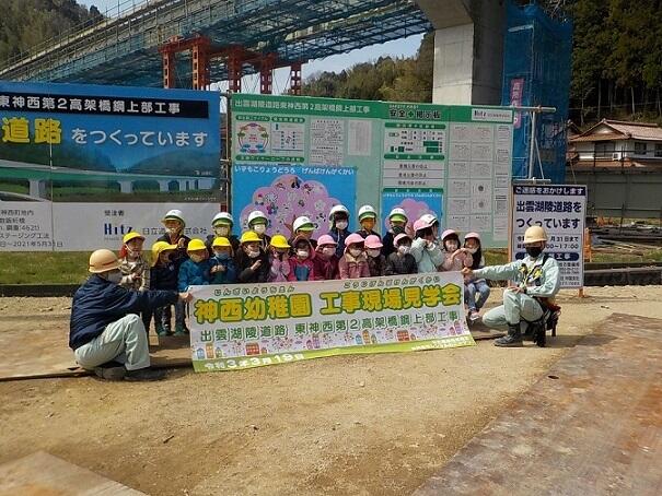 山陰道の一部である東神西第2高架橋の上部工事が竣工し、地元の神西幼稚園の園児や住民の方へ工事現場見学会を実施しました。