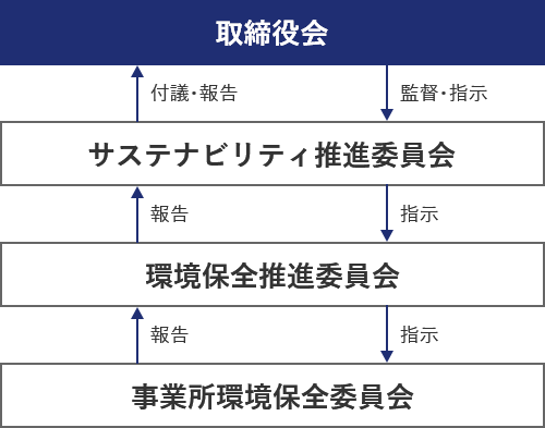 当社グループの環境保全推進体制は、サステナビリティ推進委員会の下部委員会である環境保全推進委員会と事業所環境保全委員会が中心となり、当社グループの環境保全活動を推進しています。