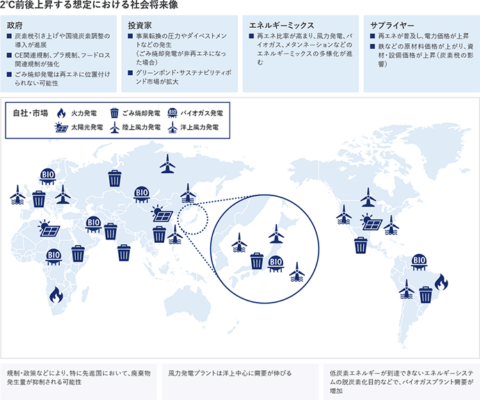 2℃シナリオでは、再生可能エネルギーの普及や温室効果ガス排出の抑制に向けた政策が進展し、原材料価格や炭素税による費用上昇の影響を受けます。一方、再生可能エネルギー比率が高まり、ごみ焼却発電施設だけでなく、バイオガスプラントや洋上風力発電の需要が増加すると期待されます。特に新興国ではごみ処理の需要が伸びることが予想されます。一方で、先進国でごみ発生量の抑制が進み、ごみ処理需要の成長が鈍化する可能性を視野に入れて、各地域の動向を随時モニタリングしながら、持続的成長のための技術革新に向けた研究開発を推進していきます。