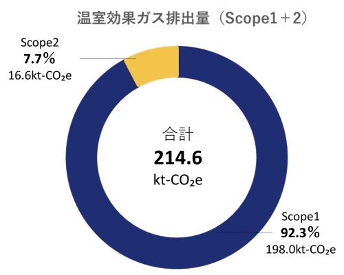売電事業の需要減少に伴うLNG投入量の減少、グリーン電力の導入推進等により、Scope1+2のGHG排出量は、基準年度に比べ39.3%減少し、224.5kt-CO₂eでした。