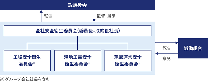 2023年7月、当社グループの安全管理水準をより一層向上させるため、社長を委員長、各事業本部長や本社管理部門長を委員とした全社安全衛生委員会を設置しました。安全衛生管理の基本方針策定や課題提起などを行い、議事内容は取締役会へ報告されます。